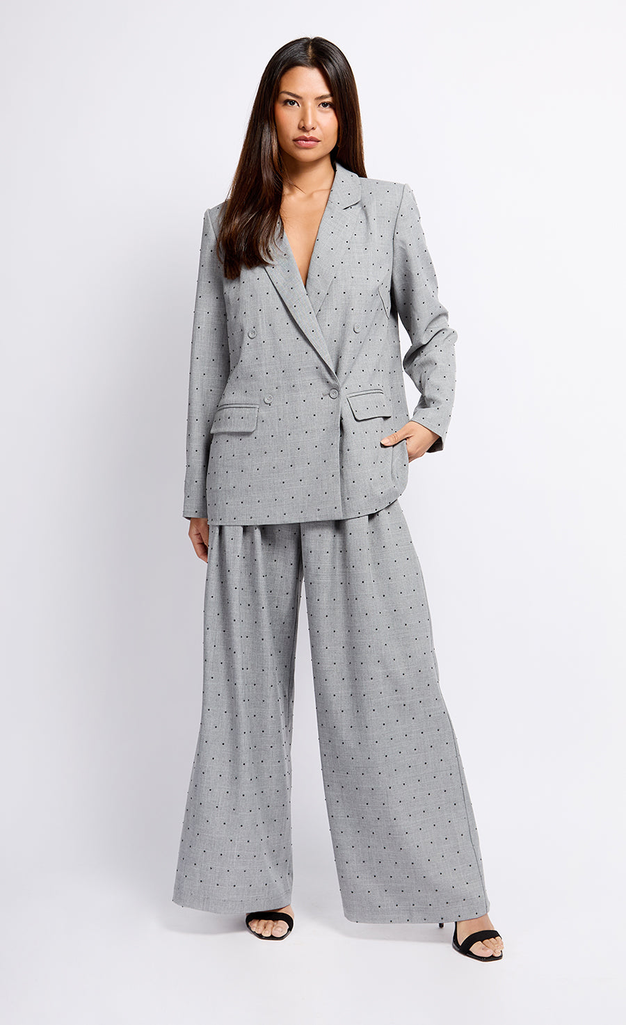 Elevate your wardrobe with our Grey Oversized Blazer adorned with striking black diamantes. This statement piece combines contemporary design with a touch of sparkle, offering a perfect balance of sophistication and style. The relaxed fit ensures comfort and versatility, making it an ideal choice for both casual and formal occasions. Pair it with your favourite jeans for a chic daytime look or drape it over an elegant dress for a night out.