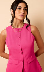 The Pink Waistcoat features a chic round neckline and sleeveless design, offering a sleek, modern silhouette. With its regular fit and length, this co-ord piece is perfect for layering over tops or dresses for a coordinated and stylish look.