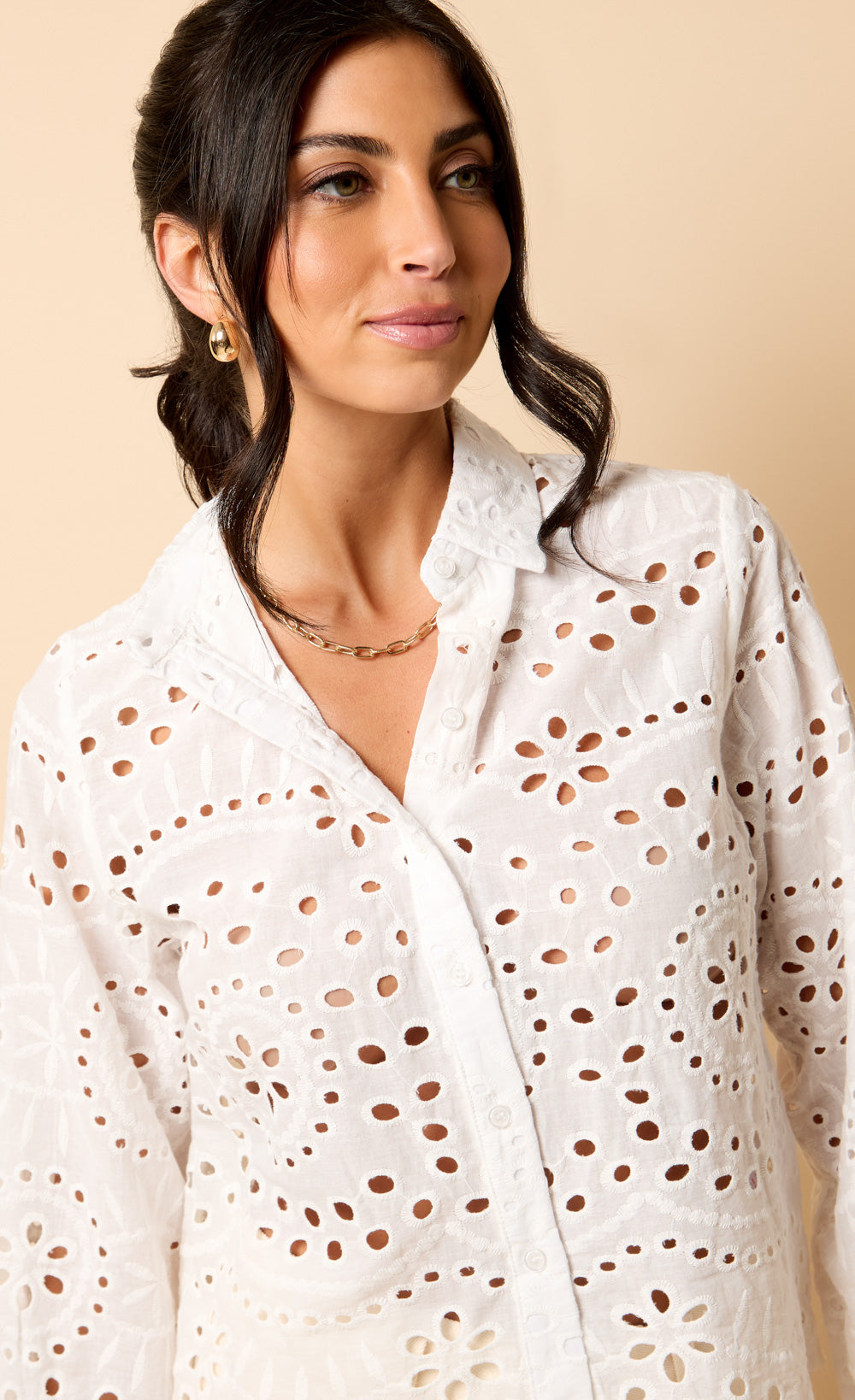 The White Broderie Shirt offers a refined look with its classic turn-down collar and intricate broderie details. With long sleeves and a regular fit, this versatile shirt is perfect for both casual and more polished outfits.