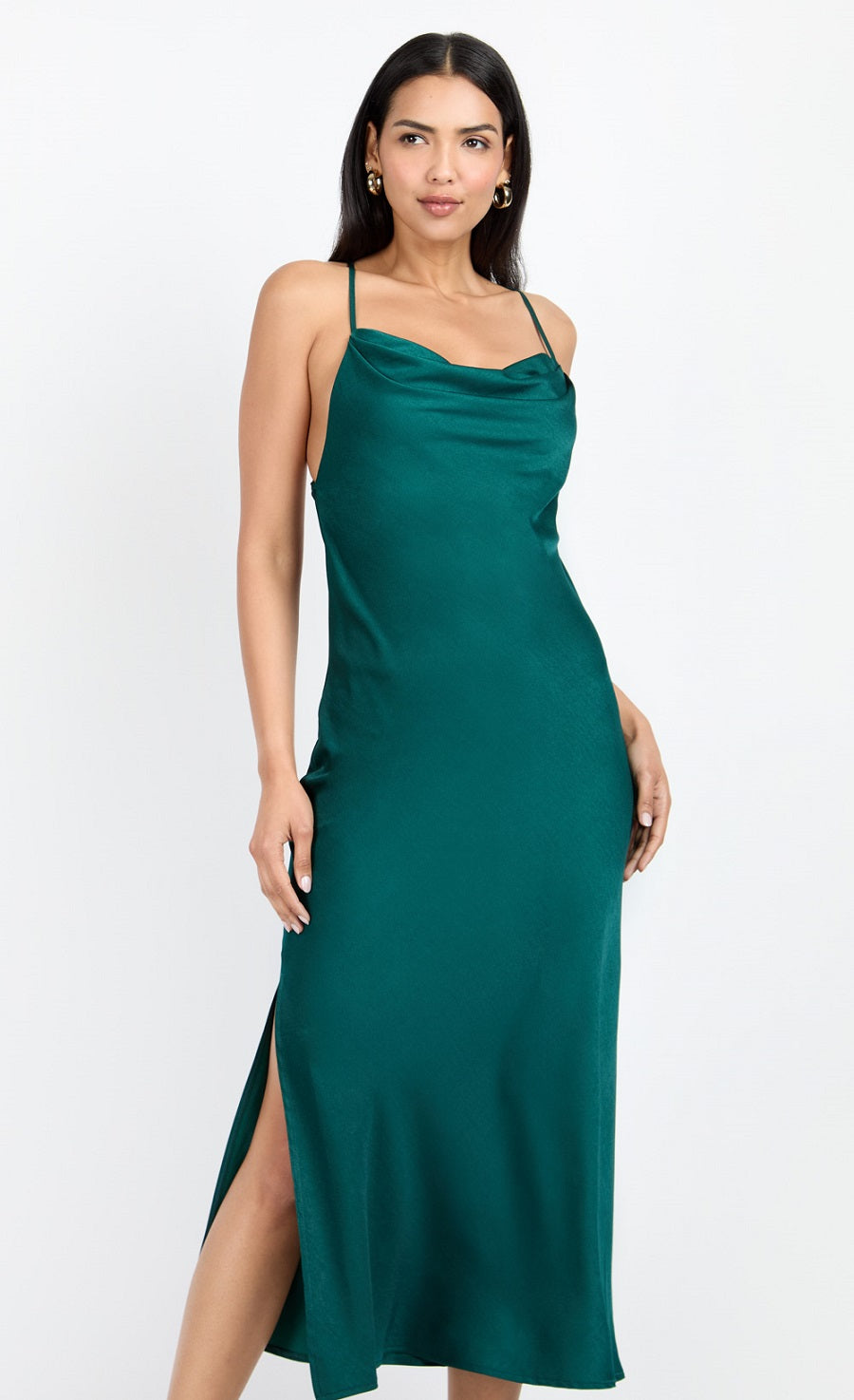 Embrace elegance with our green satin cowl neck midi dress. This luxurious dress features a sleek satin finish and a draped cowl neckline for a sophisticated touch. The flattering midi length and rich green hue make it perfect for any special occasion. Step into timeless style and effortless grace with this stunning piece.