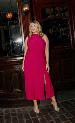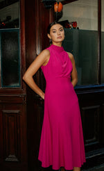 Step into elegance with our Pink Drape Neck Detail Midi Dress. This dress features a bold pink hue that exudes femininity and charm, making it perfect for various occasions. The drape neck detail adds a touch of sophistication and effortlessly enhances the dress's fluid silhouette. The midaxi length offers a timeless appeal, while the tailored fit accentuates your natural curves.