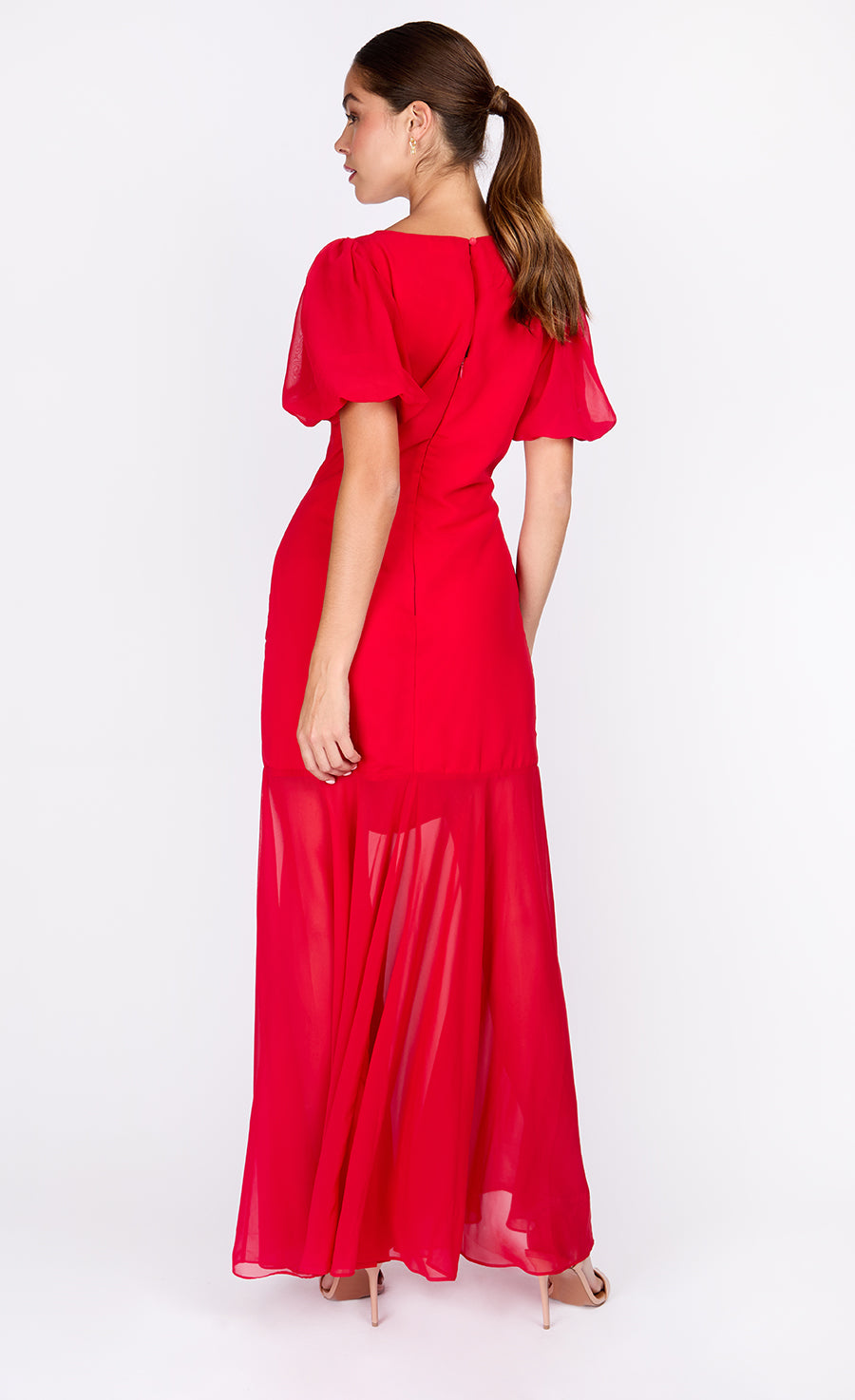 The Red Chiffon Puff Sleeve Maxi Dress is an effortlessly chic piece perfect for day-to-evening style. Crafted from airy chiffon, it features romantic puff sleeves and a flowing silhouette that exudes elegance. Ideal for weddings, parties, or a stylish brunch outing.